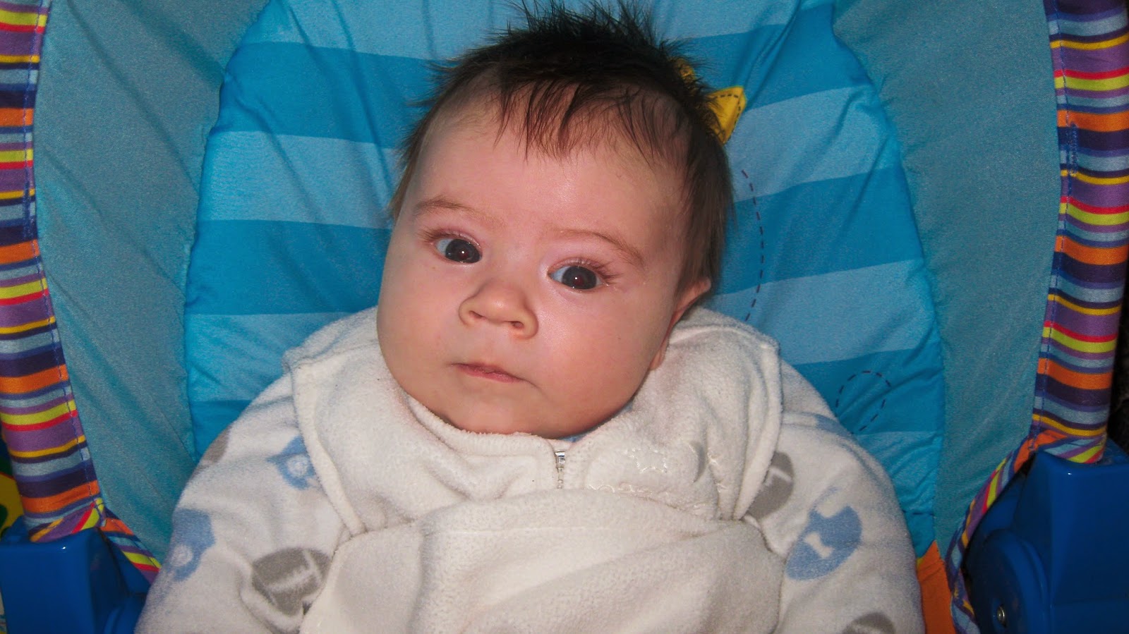 Blaise is growing more every day. He now smiles all the time and even laughs from time to time. He is a little fussy at night still but sleeps for much longer stretches now, which is good for mom. :)